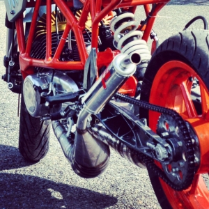 משך בניית האופנוע ארך כשנה כשרק התאמת המנוע לשילדת מסבך הצינורות ארכה כשלושה חודשים. השילדה עצמה נרכשה יחד עם הגלגלים ממגרש גרוטאות שמכר אותם לאחר תאונה שהשביתה את הק.ט.מ Duke.